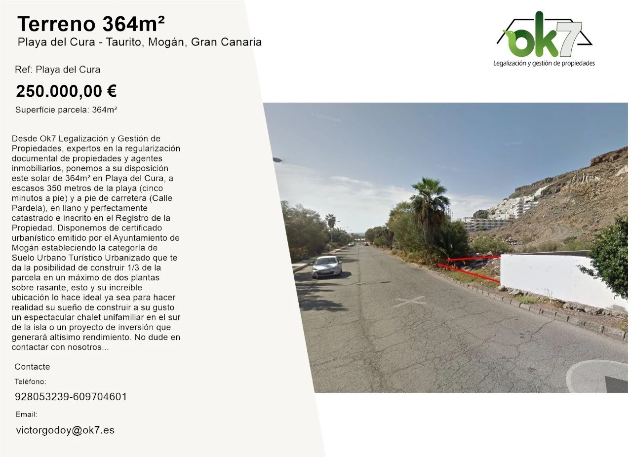 Desde Ok7 Legalización y Gestión de Propiedades, expertos en la regularización documental de propiedades y agentes inmobiliarios, ponemos a su disposición este solar de 364m² en Playa del Cura, a escasos 350 metros de la playa (cinco minutos a pie) y a pie de carretera (Calle Pardela), en llano y perfectamente catastrado e inscrito en el Registro de la Propiedad. Disponemos de certificado urbanístico emitido por el Ayuntamiento de Mogán estableciendo la categoría de Suelo Urbano Turístico Urbanizado que te da la posibilidad de construir 1/3 de la parcela en un máximo de dos plantas sobre rasante, esto y su increible ubicación lo hace ideal ya sea para hacer realidad su sueño de construir a su gusto un espectacular chalet unifamiliar en el sur de la isla o un proyecto de inversión que generará altísimo rendimiento. No dude en contactar con nosotros y estaremos encantados de aclarar cualquier duda al respecto.